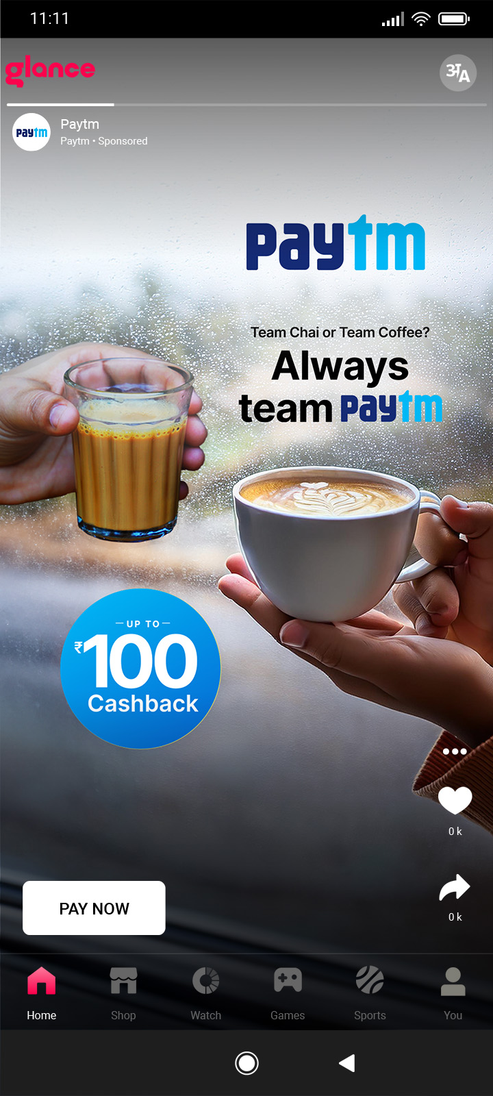 This Paytm ad prompts "Team Chai or Team Coffee? Always team Paytm," offering up to Rs. 100 cashback, targeting users with a playful question around daily habits. The creative with offer and drink makes it relatable and fun to engage and win cashbacks. The Glance Lockscreen and Feed creatives highlighting the convenience of Paytm effectively drove app installs.